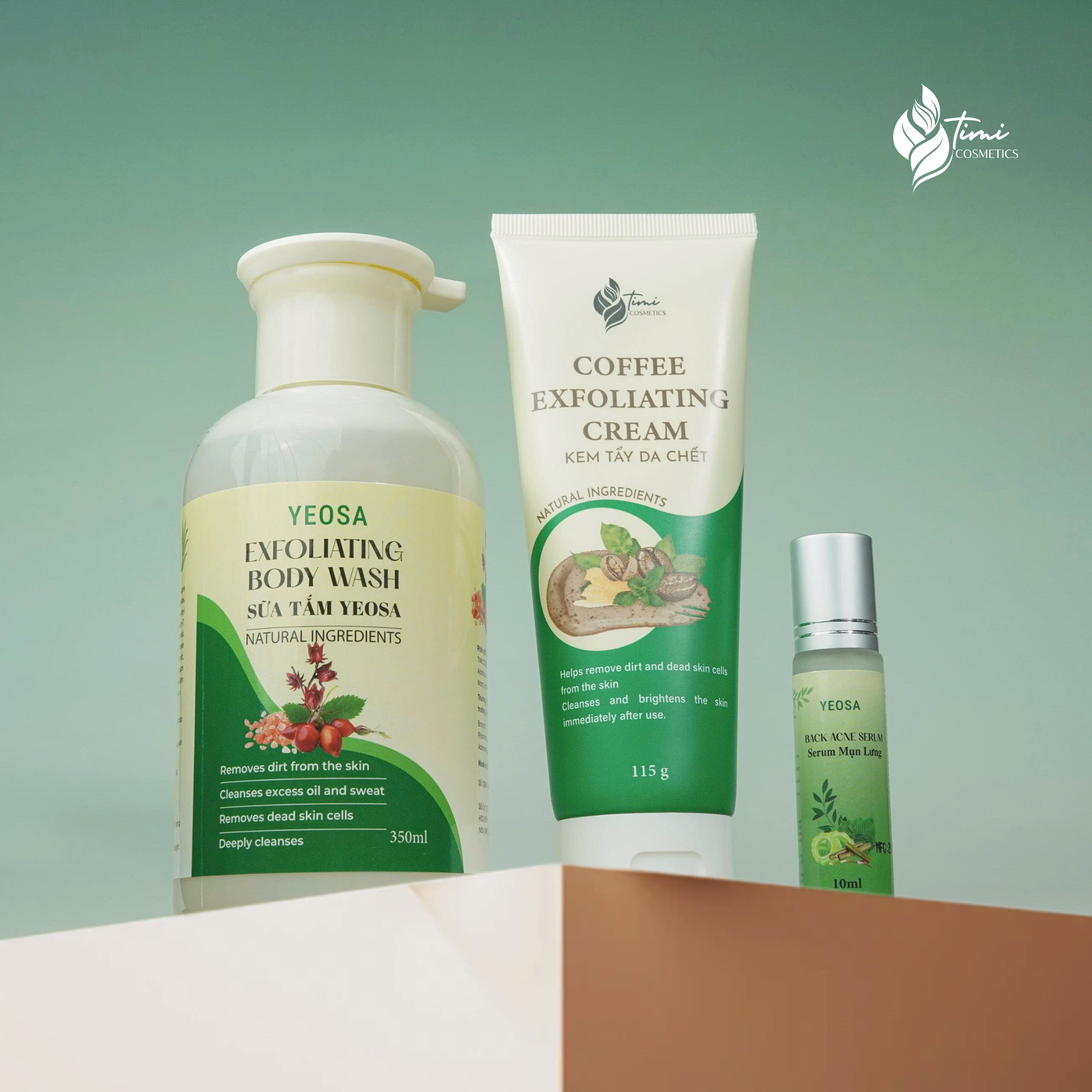 Bộ sản phẩm dưỡng da cao cấp YEOSA 4- một giải pháp toàn diện dành riêng cho những làn da gặp phải tình trạng mụn trên cơ thể. Với sứ mệnh mang lại làn da khoẻ mạnh và tự tin, bộ sản phẩm YEOSA bao gồm các sản phẩm chính: 01 Sữa Tắm 350 ml, 01 Kem Tẩy Tế Bào Chết 115g và 02 Serum trị mụn lưng 10 ml. Sử dụng các thành phần chiết xuất tự nhiên an toàn và hiệu quả, YEOSA không chỉ làm sạch sâu mà còn giúp cân bằng độ ẩm, làm dịu và điều trị các vấn đề da liên quan đến mụn. Sản phẩm đã được khách hàng tại nhiều quốc gia như Nhật Bản, Hàn Quốc, Úc và Đài Loan tin dùng và yêu thích, chứng minh cho sự hiệu quả và an toàn của nó. Nếu bạn đang gặp phải vấn đề về mụn trên cơ thể, YEOSA sẽ là người bạn đồng hành đáng tin cậy trong hành trình chăm sóc da của bạn.