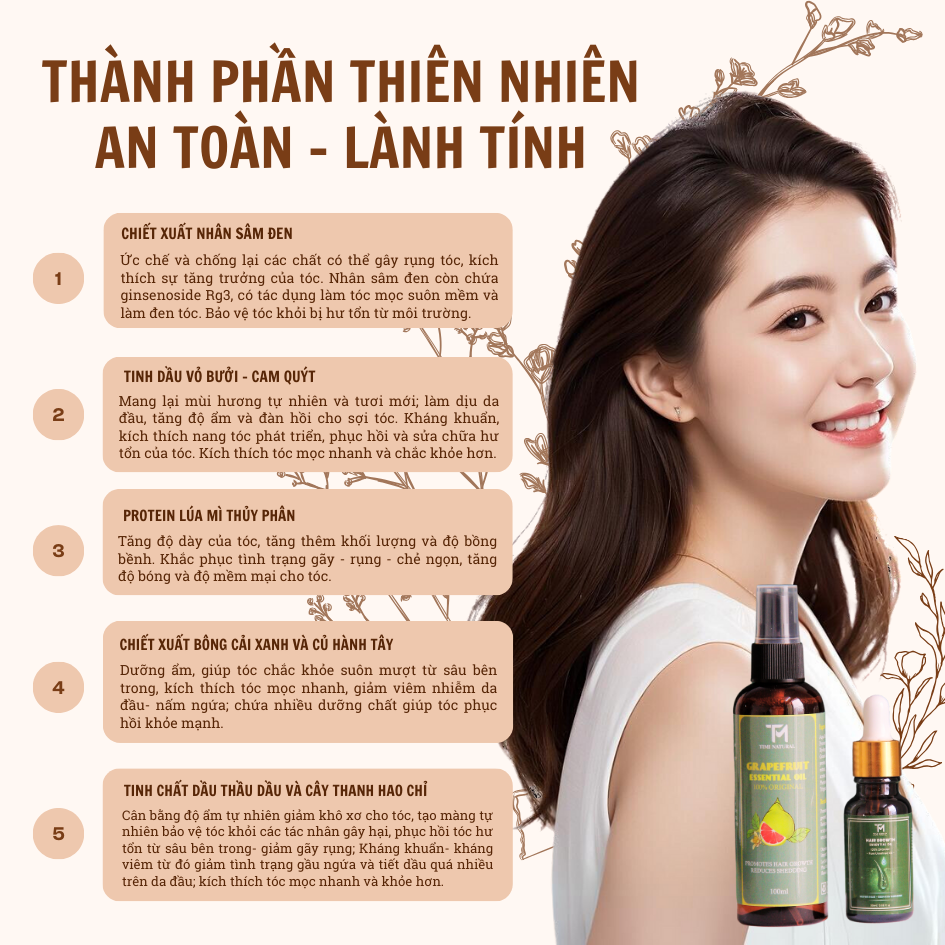 Thành phần tự nhiên của Tinh Dầu Bưởi TIMI không chỉ nuôi dưỡng nang tóc mà còn hỗ trợ quá trình tóc mọc nhanh, giúp mái tóc trở nên dày và mạnh mẽ hơn.