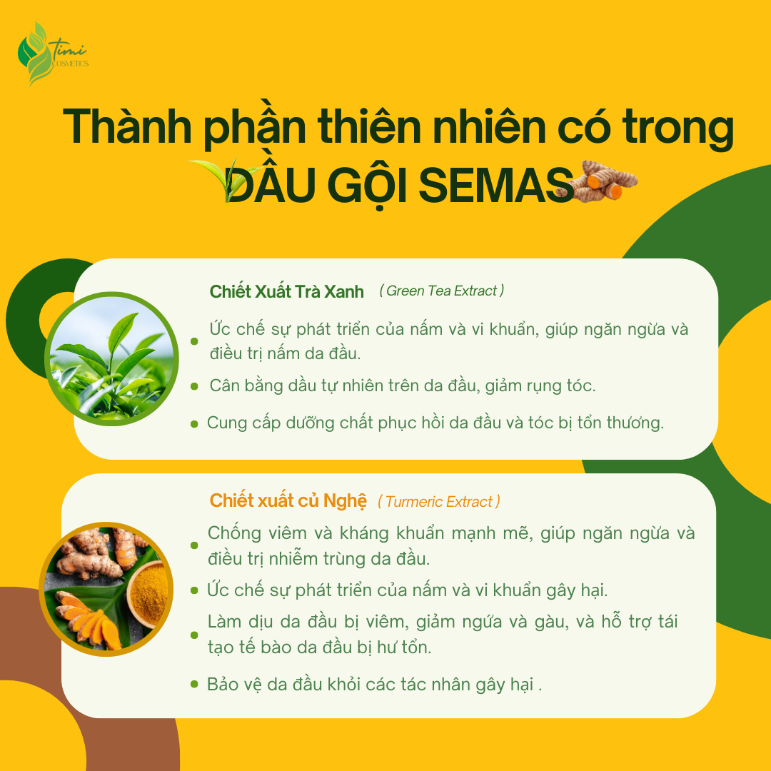 Dầu gội SEMAS dung tích 100ml là sự kết hợp hoàn hảo giữa chiết xuất trà xanh và nghệ, mang lại giải pháp chăm sóc tóc và da đầu toàn diện. Với công thức đặc biệt từ thiên nhiên, sản phẩm không chỉ giúp ngăn ngừa và điều trị gàu, nấm da đầu mà còn làm dịu da, giảm viêm và phục hồi những tổn thương do hóa chất hay tác động từ môi trường. Dầu gội SEMAS 100ml nhẹ nhàng làm sạch, nuôi dưỡng sâu từ gốc đến ngọn, giúp mái tóc bạn luôn khỏe mạnh và da đầu sạch sẽ, dễ chịu.