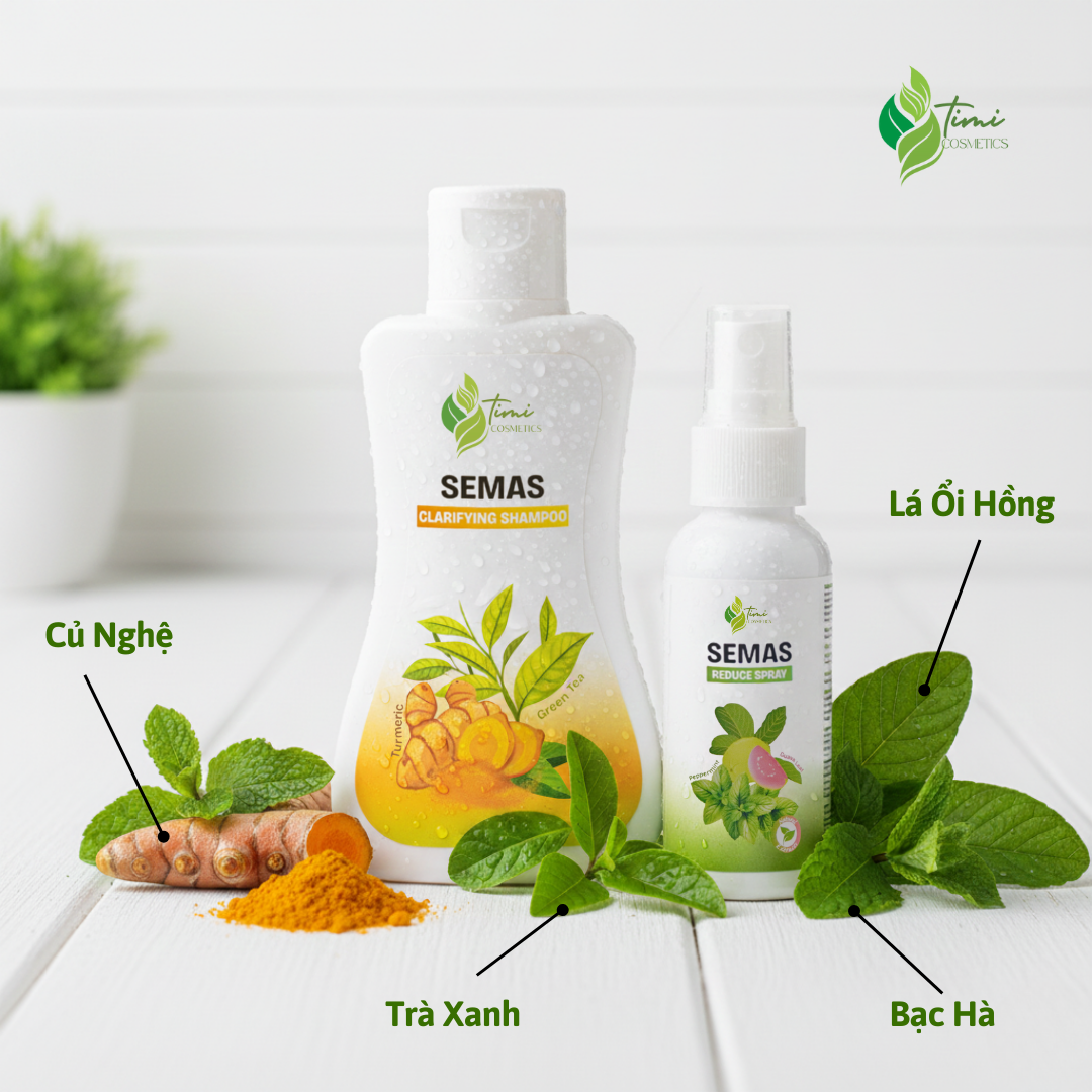 Giới thiệu bộ sản phẩm SEMAS, bao gồm dầu gội và xịt tinh chất, được thiết kế đặc biệt để ngăn ngừa và điều trị gàu ngứa, nấm da đầu. Với chiết xuất từ thiên nhiên như bạc hà, lá ổi hồng, nghệ, trà xanh cùng nhiều thành phần khác, sản phẩm giúp giảm nhanh tình trạng gàu ngứa, nấm da đầu, viêm da tiết bã. Đồng thời, SEMAS còn phục hồi tóc và da đầu bị tổn thương, kích thích tóc mọc trở lại, mang đến mái tóc khỏe mạnh và da đầu sạch sẽ.