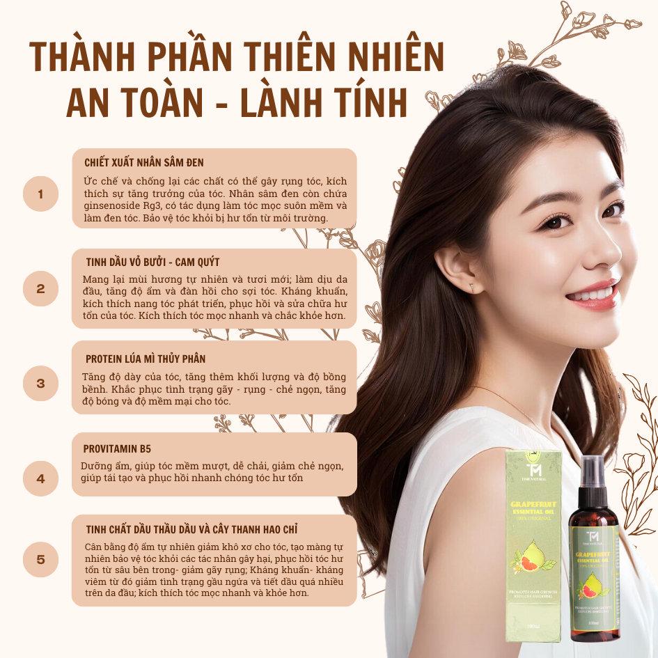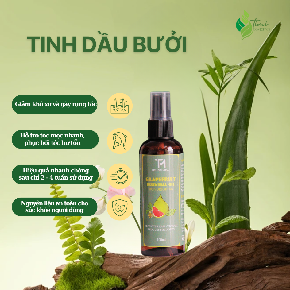 Thành phần tự nhiên của Tinh Dầu Bưởi TIMI không chỉ nuôi dưỡng nang tóc mà còn hỗ trợ quá trình tóc mọc nhanh, giúp mái tóc trở nên dày và mạnh mẽ hơn.